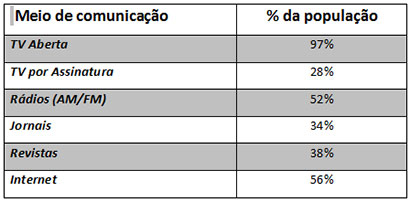 A avaliação destes dados deve levarem consideração também o alcance praticamente universal da televisão de sinal aberto junto às famílias brasileiras. De acordo com pesquisa recente do Ibope1, divulgada em 2011, a TV alcança 97% de nossa população, superando largamente todos os outros tipos de mídia.